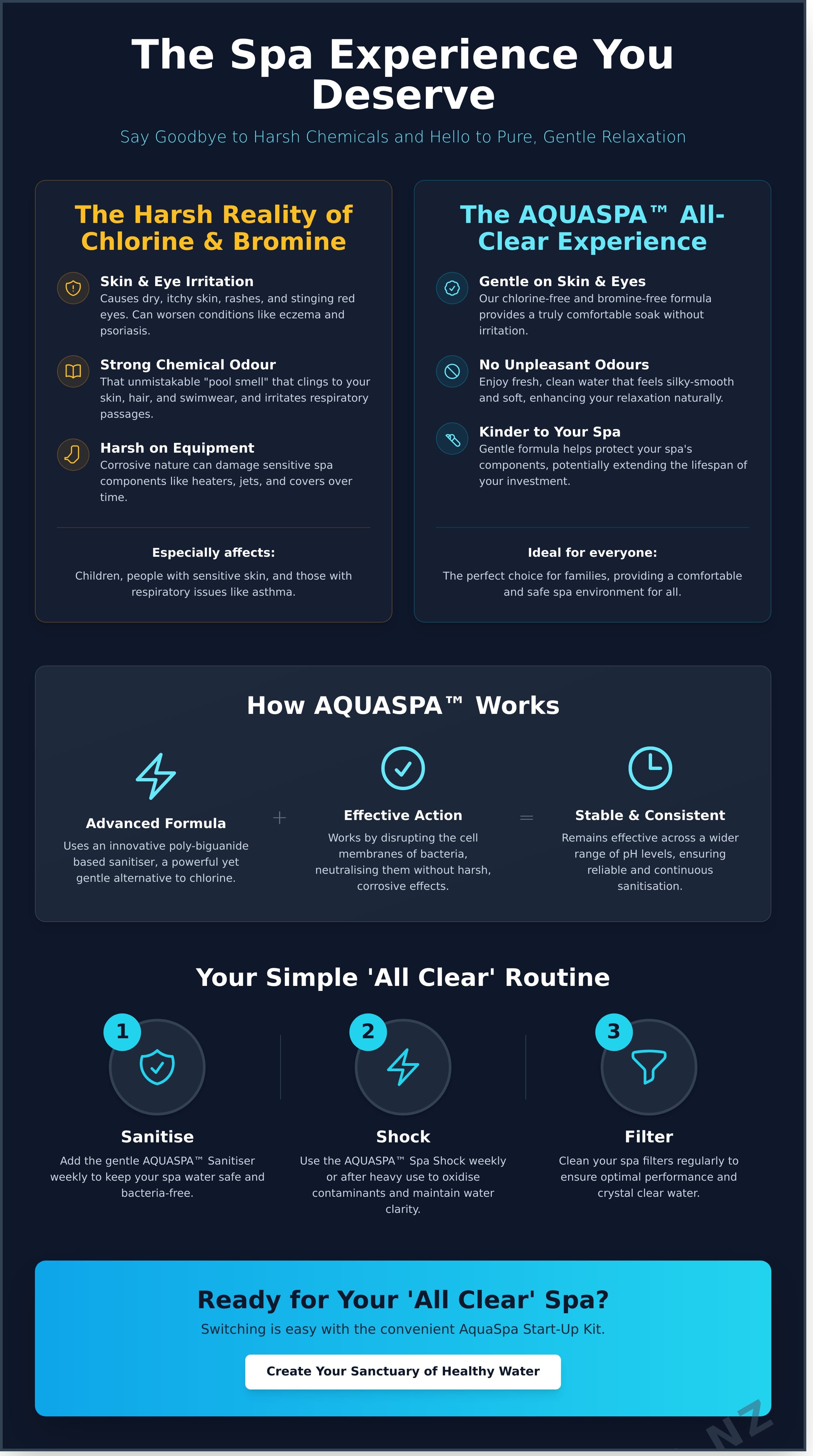 For many Kiwis, the joy of a spa pool is often overshadowed by the harsh effects of traditional sanitisers. That's why we created AQUASPA™, a proven, trusted system designed with your wellbeing in mind. Our core mission is simple: to provide healthy, sparkling water that is gentle on you and your family. We believe that achieving a pristine spa shouldn't come at the cost of your comfort. With AQUASPA™, you get the peace of mind that comes from a revolutionary approach to water care, giving you the all clear for a relaxing, worry-free soak.