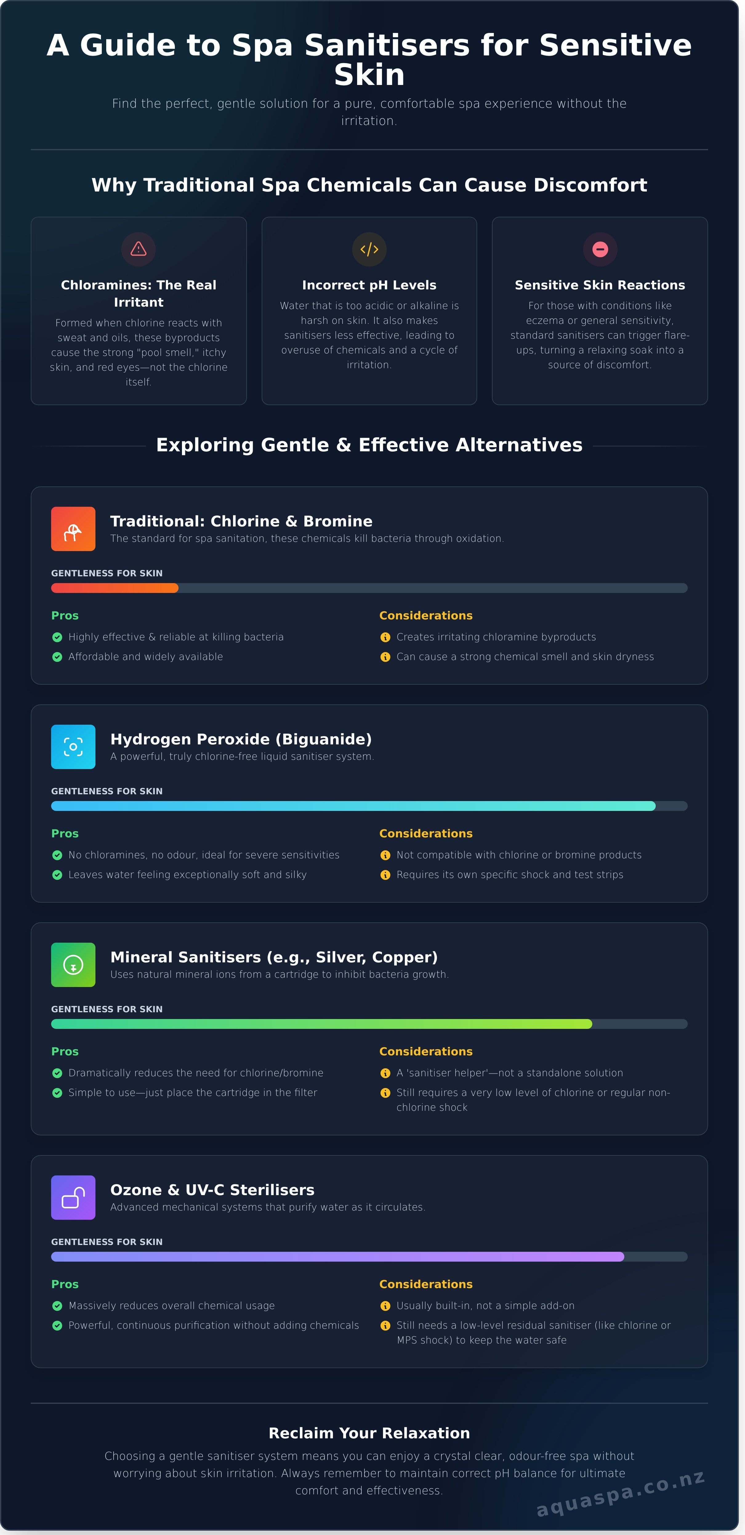 - Learn how to compare different sanitiser options to find the perfect spa chemicals for sensitive skin nz for your family, considering cost, maintenance, and water feel.
